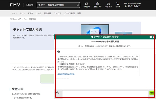FMVパソコンご購入に関するご相談にチャットで対応します。お気軽にご利用ください。ご利用は無料です。