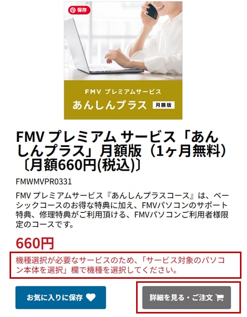 機種選択が必要なサービス- 機種選択が必要なメッセージが表示され、「詳細を見る・ご注文」ボタンがグレーで押せない状態になっています。
